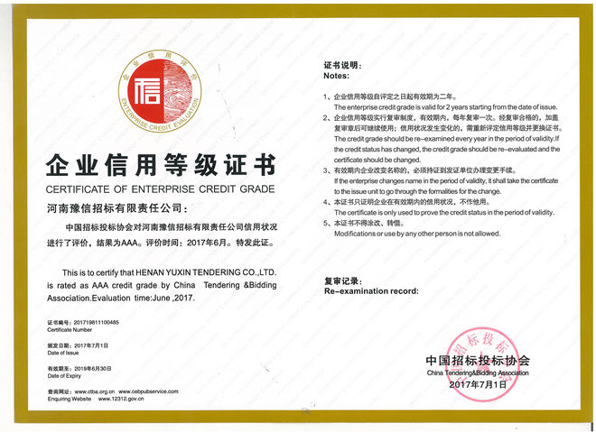 中國招投標(biāo)協(xié)會3A企業(yè)信用等級證書