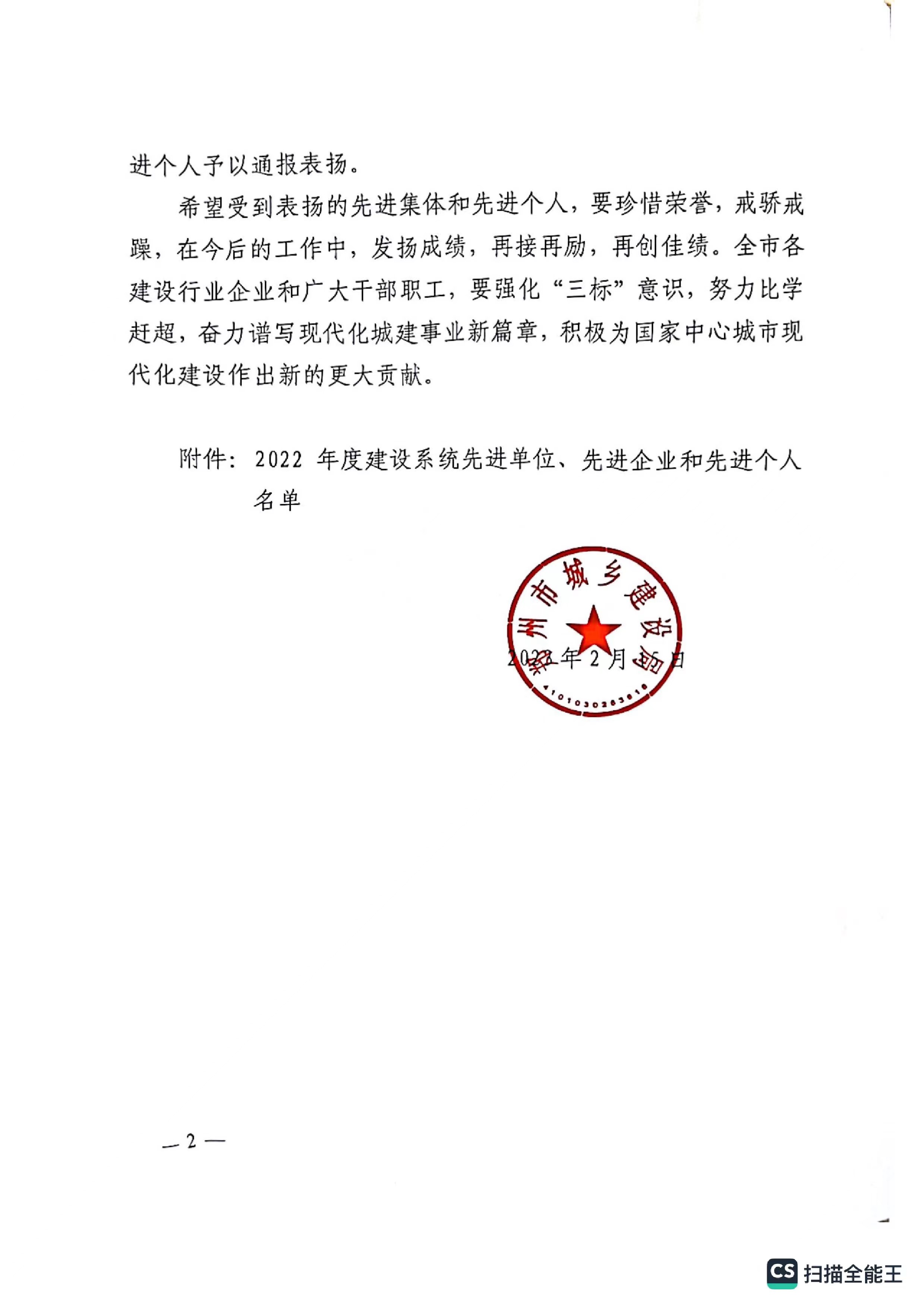 熱烈祝賀我公司獲得鄭州市城鄉(xiāng)建設局評定“2022年度建設系統(tǒng)先進單位“企業(yè)稱號。