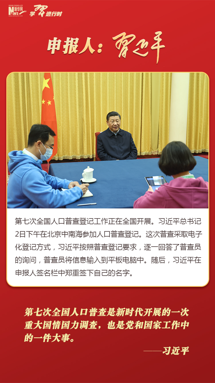 習近平在北京中南海參加全國人口普查登記,帶頭申報。他按照普查登記要求,逐一回答了普查員的詢問,并在申報人簽名欄中鄭重簽下自己的名字。