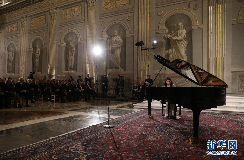 2020年2月13日,在意大利羅馬總統(tǒng)府奎里納萊宮,旅意華人鋼琴家居覲在音樂會(huì)現(xiàn)場(chǎng)演奏。當(dāng)日,由意大利總統(tǒng)馬塔雷拉提議,在2020年中意文化旅游年計(jì)劃外加演的一場(chǎng)鋼琴獨(dú)奏音樂會(huì)在意大利總統(tǒng)府舉行,向抗擊新冠肺炎疫情的中國人民傳達(dá)友誼和支持。新華社記者 程婷婷 攝