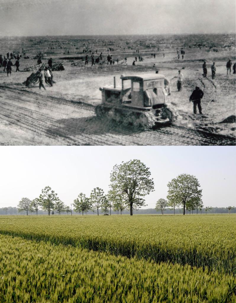 拼版照片:上圖為20世紀60年代河南省蘭考縣改造鹽堿地的情形(資料照片);下圖為蘭考縣堌陽鎮(zhèn)的一片麥田(2014年5月5日新華社記者朱祥攝)。新華社發(fā)