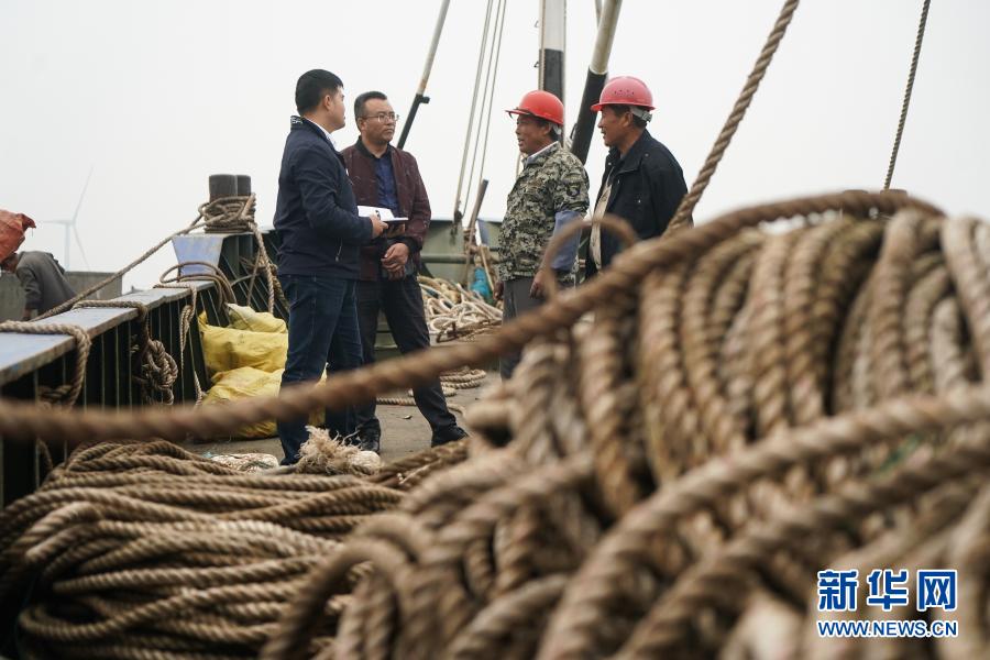 2020年10月21日,江蘇省海安市濱海新區(qū)紀(jì)工委干部(左一、左二)向漁船負(fù)責(zé)人詢問惠漁油補發(fā)放情況。 新華社記者 季春鵬 攝