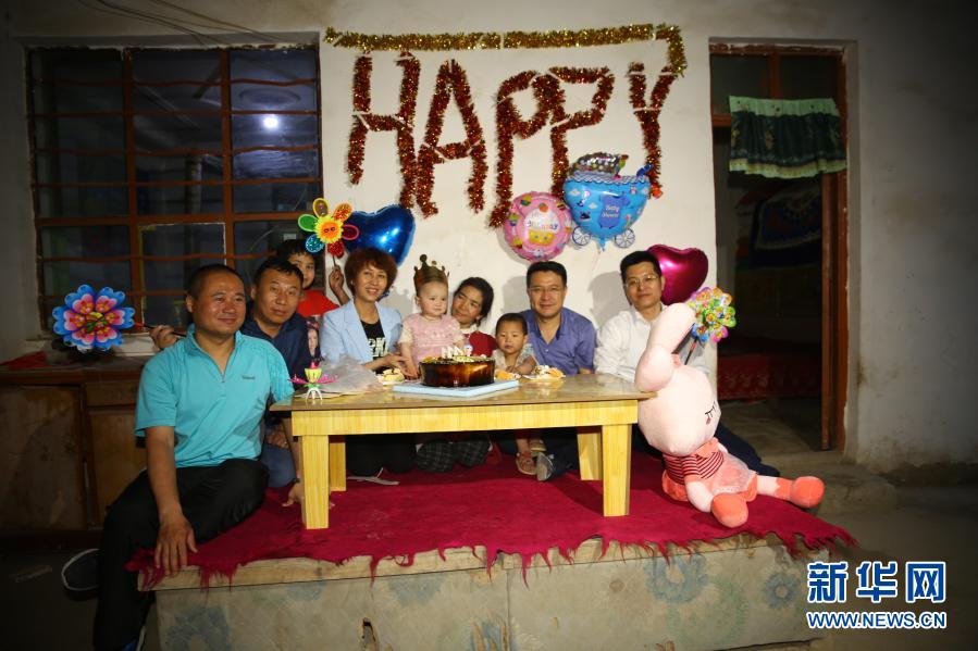 席世明(左二)和其他援疆干部一同給維吾爾族小姑娘“小石榴”過(guò)生日(資料照片)。新華社發(fā)