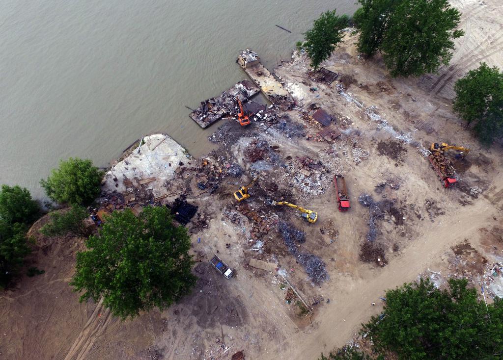 2016年5月18日,工作人員在武漢余家頭非法碼頭整治清理現(xiàn)場進(jìn)行收尾工作。新華社記者 程敏 攝