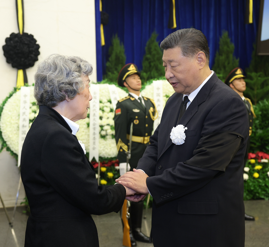 ??10月14日,吳邦國(guó)同志遺體在北京八寶山革命公墓火化。習(xí)近平、趙樂(lè)際、王滬寧、蔡奇、丁薛祥、李希、韓正等前往八寶山送別,胡錦濤送花圈表示哀悼。這是習(xí)近平與吳邦國(guó)親屬握手,表示深切慰問(wèn)。新華社記者 鞠鵬 攝
