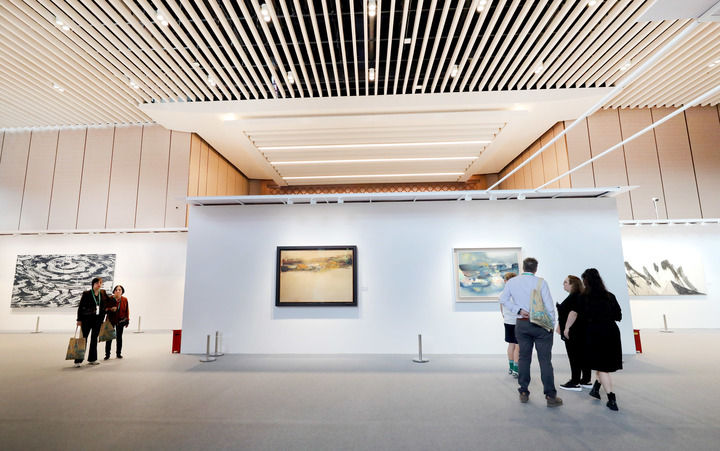 ??11月9日,觀眾在第七屆進(jìn)博會國際現(xiàn)當(dāng)代藝術(shù)專區(qū)觀看繪畫藝術(shù)展品。新華社記者 方喆 攝