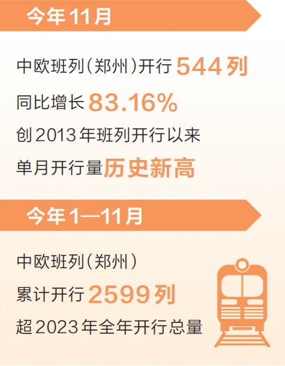 12月2日,記者獲悉,今年11月,中豫港務(wù)集團(tuán)鄭州陸港公司開行中歐班列(鄭州)544列,同比增長83.16%,創(chuàng)2013年班列開行以來單月開行量歷史新高。中歐班列(鄭州)今年1—11月累計(jì)開行2599列,超2023年全年開行總量。