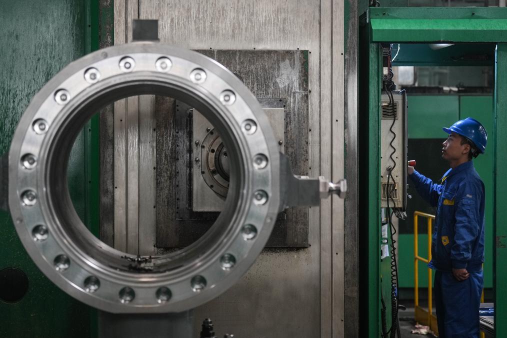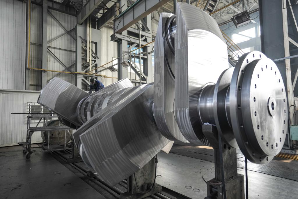 ??2024年1月11日,工人在大連華銳船用曲軸有限公司加工車間加工產(chǎn)品。新華社記者 潘昱龍 攝